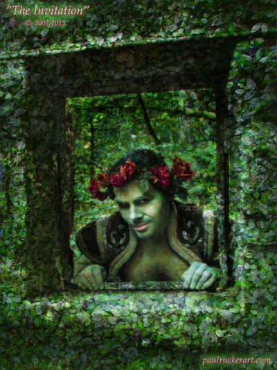 Visiting Faerieworlds in my own male faerie character inspired me to explore other ways to depict men in the spiritual landscape of Faerie. I enlisted my friend James as one of my first models for photographic explorations in this vein. James has a very strong Green Man quality, so I painted him on three separate shoots as three subtle variations of the same persona, in three distinctly different environments in Portland, OR.